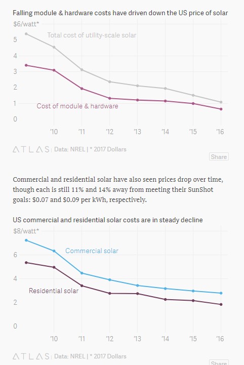 On Tuesday (Sept. 12), the US Department of Energy announced that utility-grade solar panels have hit 2020 cost targets three years early. Utility-scale solar now averages around $1 per watt (the cost of the hardware’s electricity generation capacity) and $0.06 per kilowatt-hour (the cost of the electricity consumed), targets set in 2011 by the DOE’s SunShot Initiative.